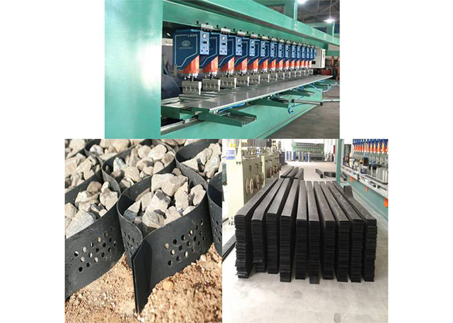 土工格室是由強化的HDPE片材料,經高強力焊接而形成的一種三維網狀格室結構。一般經超聲波針式焊接而成。因工程需要,有的在膜片上進行打孔。